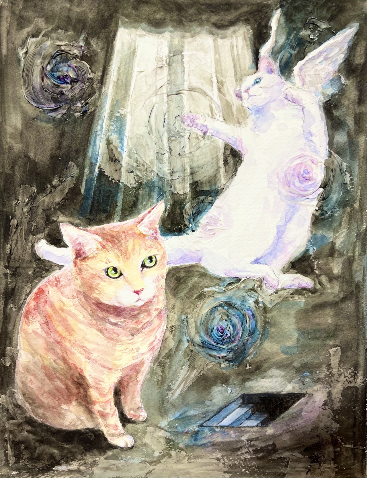 昨年12月に亡くなった愛猫も絵の中で変わらず励ましてくれました。猫を中心に人物や静物をいろいろな画材で表現しています。多くの方にご覧いただければ幸いです。