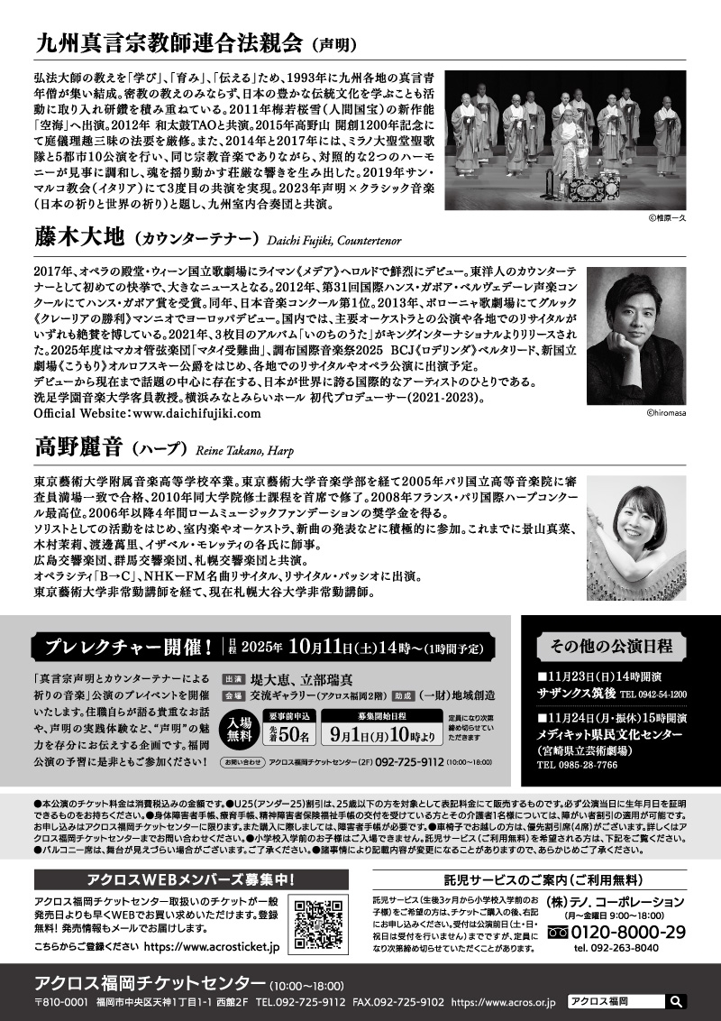 第一部では、東洋の祈りの音楽として「声明」を披露。続けて第ニ部では、ハープ奏者の高野麗音の演奏による「アヴェ・マリア」を、藤木大地のカウンターテナーが共演します。そして注目のコラボステージである第三部では、東西の祈りの音楽が一つとなる、全く新しい声楽を披露します。