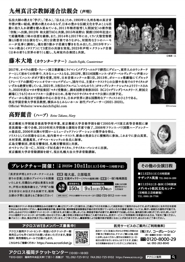 果てしなく舞い上がるカウンターテナーの自由な声と、足元から湧き上がる地を揺るがすような声明の旋律。ふたつの声の芸術が天井から降り注ぐとき、極上の響きを体感できることでしょう。