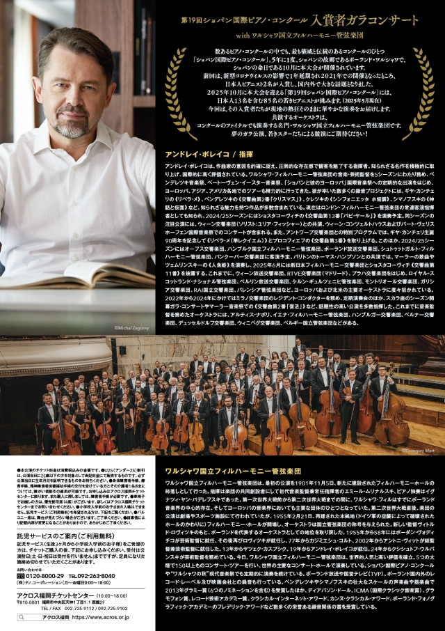 この熱気冷めやらぬ中、アクロス福岡では、同コンクールの入賞者を迎えたガラコンサートを開催いたします。現地で巻き起こった感動と熱狂をそのままに、華やかな演奏を披露します。共演は、コンクールの最終選考でも演奏を担当した名門、ワルシャワ国立フィルハーモニー管弦楽団。ショパンの名曲が深く、美しく響き渡る一夜となることでしょう。