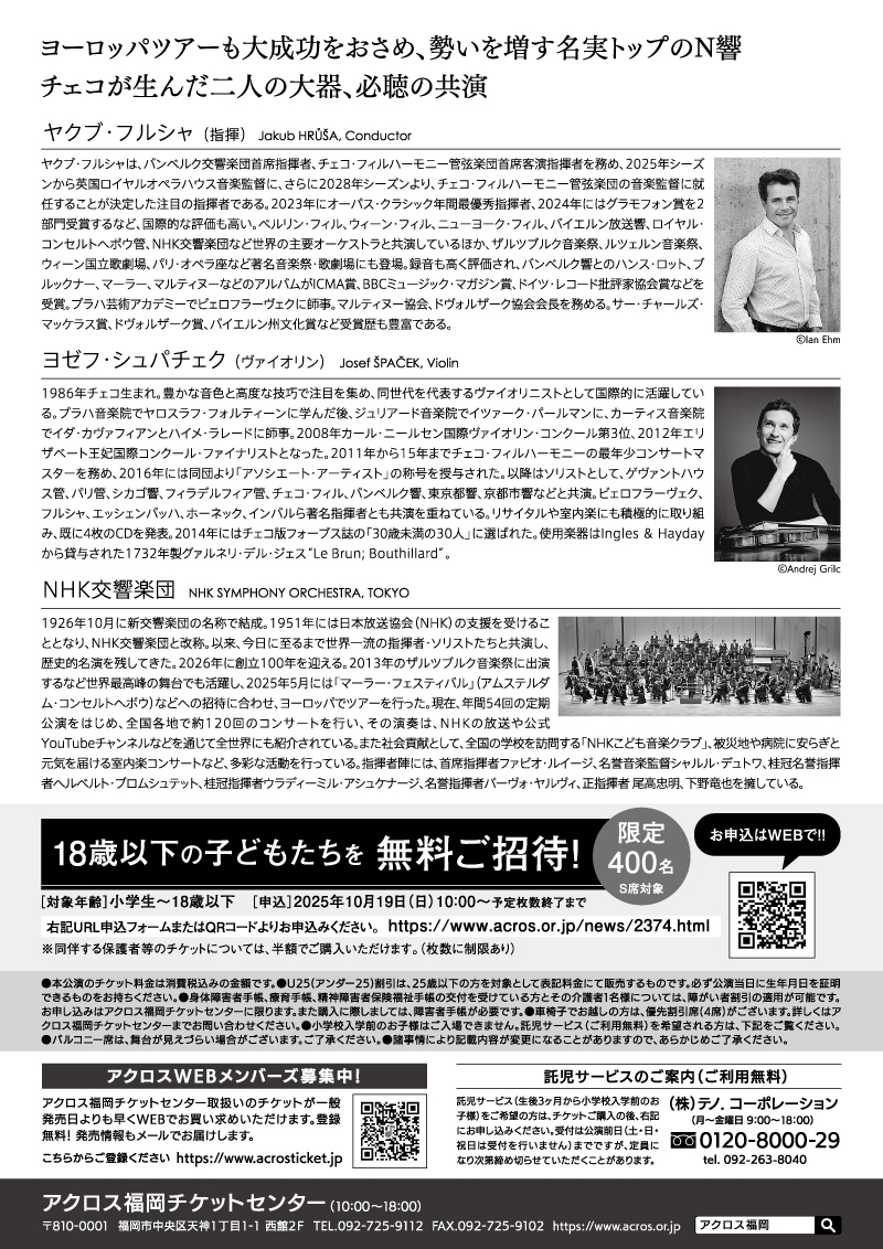 ・アクロス福岡チケットセンター(10:00~18:00 窓口/電話) TEL:092-725-9112 ・アクロスWEBチケット https://www.acrosticket.jp ・チケットぴあ(Pコード:295-177) https://t.pia.jp ・ローソンチケット(Lコード:84930) https://l-tike.com |