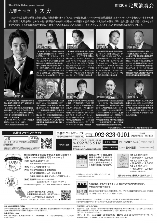 ・アクロスWEBチケット https://www.acrosticket.jp ・アクロス福岡チケットセンター(10:00~18:00 窓口/電話) TEL:092-725-9112 ・九響チケットサービス TEL:092-823-0101 ・チケットぴあ (Pコード:287-524) https://t.pia.jp ・ローソンチケット(Lコード:84485) https://l-tike.com |
