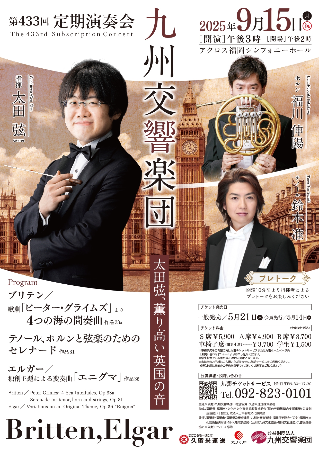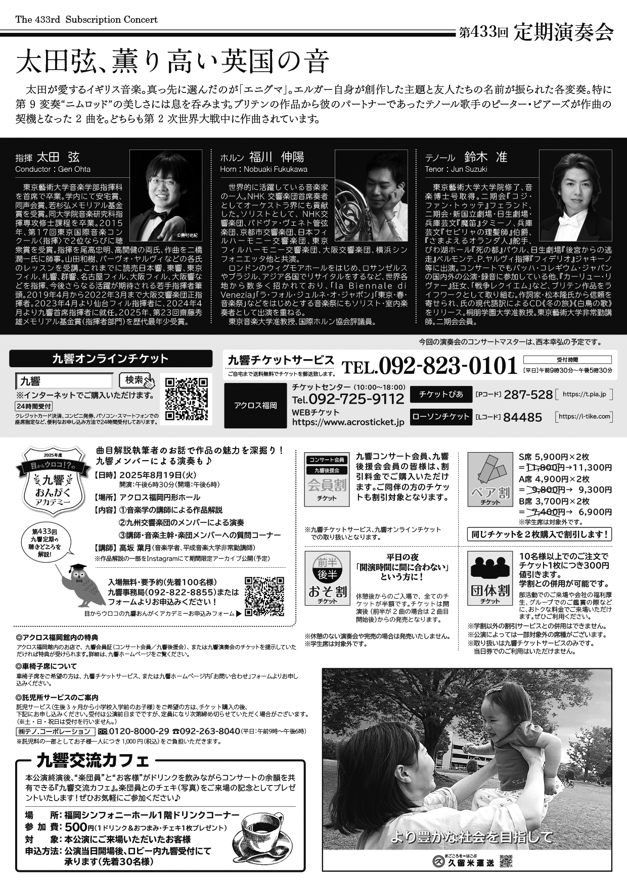 ・アクロス福岡チケットセンター TEL:092-725-9112 ・アクロスWEBチケット https://www.acrosticket.jp ・九響チケットサービス TEL:092-823-0101 ・チケットぴあ(Pコード:287-528) https://t.pia.jp ・ローソンチケット(Lコード:84485) https://l-tike.com |