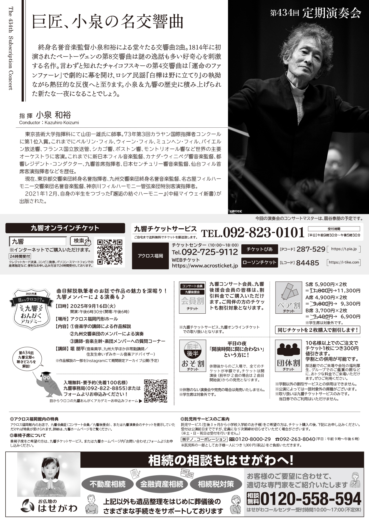 ・アクロス福岡チケットセンター TEL:092-725-9112 ・アクロスWEBチケット https://www.acrosticket.jp ・九響チケットサービス TEL:092-823-0101 ・チケットぴあ (Pコード:287-529) https://t.pia.jp ・ローソンチケット(Lコード:84485) https://l-tike.com |