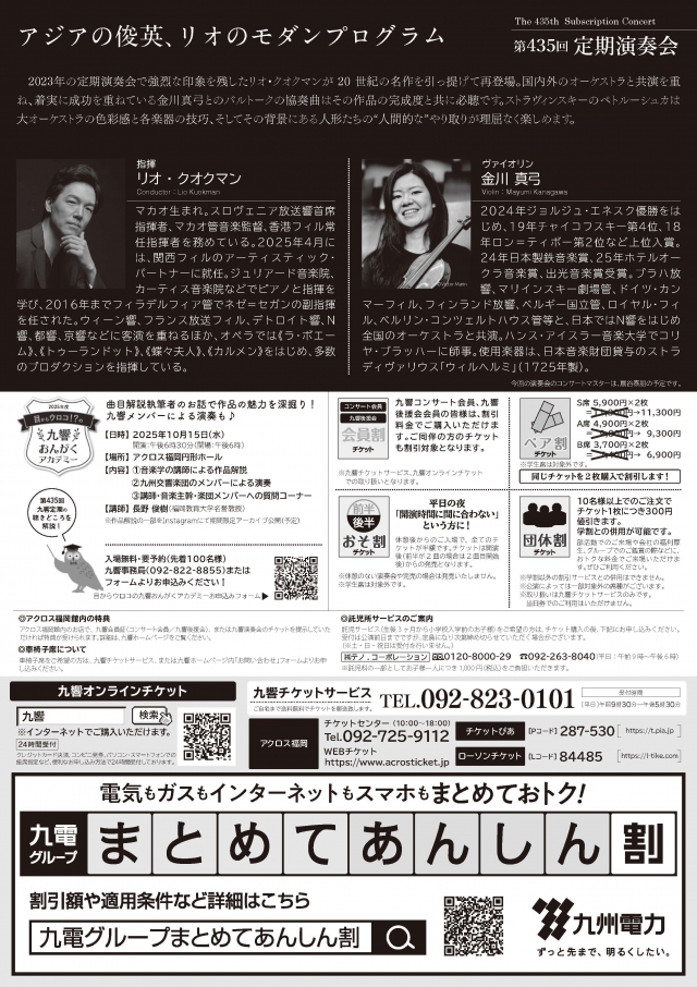 ・アクロスWEBチケット https://www.acrosticket.jp ・アクロス福岡チケットセンター(10:00~18:00 窓口/電話) TEL:092-725-9112 ・九響チケットサービス TEL:092-823-0101 ・チケットぴあ (Pコード:287-530) https://t.pia.jp ・ローソンチケット(Lコード:84485) https://l-tike.com |