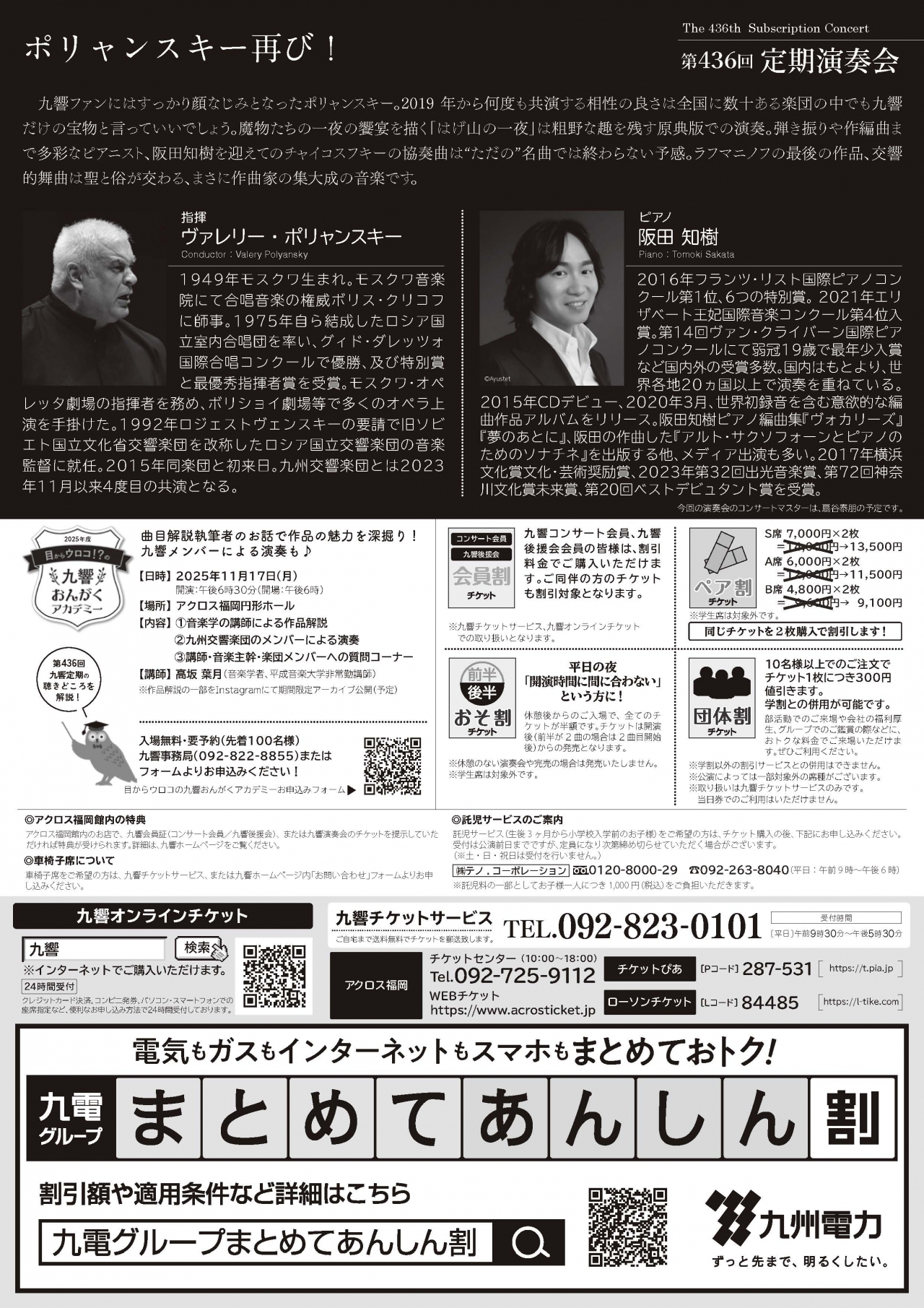 ・アクロス福岡チケットセンター(10:00~18:00 窓口/電話) TEL:092-725-9112 ・アクロスWEBチケット https://www.acrosticket.jp ・九響チケットサービス TEL:092-823-0101 ・チケットぴあ (Pコード:287-531) https://t.pia.jp ・ローソンチケット(Lコード:84485) https://l-tike.com |