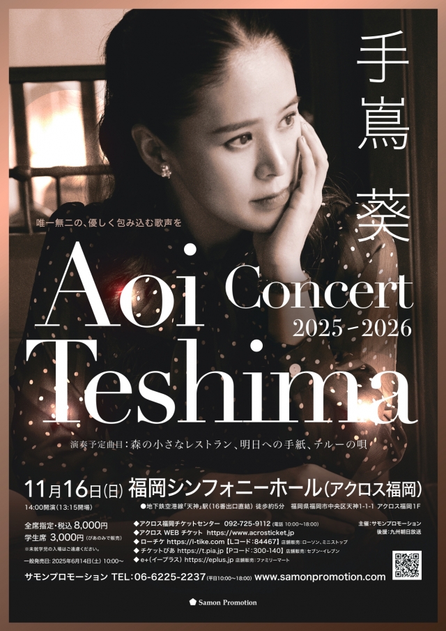 ・アクロス福岡チケットセンター TEL:092-725-9112 ・アクロスWEBチケット https://www.acrosticket.jp ・チケットぴあ(Pコード 300-140) https://t.pia.jp ・ローソンチケット(Lコード 84467) https://l-tike.com ・e+(イープラス) https://eplus.jp ・サモンプロモーション TEL:06-6225-2237(平日10:00~18:00) |