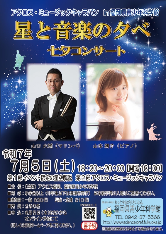 アクロス・ミュージックキャラバンは、文化活動の活性化を目的に、アクロス福岡が県内の美術館、博物館、科学館等のミュージアムや、天神周辺地域の施設と連携して開催するコンサートです。今回は、プラネタリウムと音楽を同時に楽しめるコンサートを開催いたします。