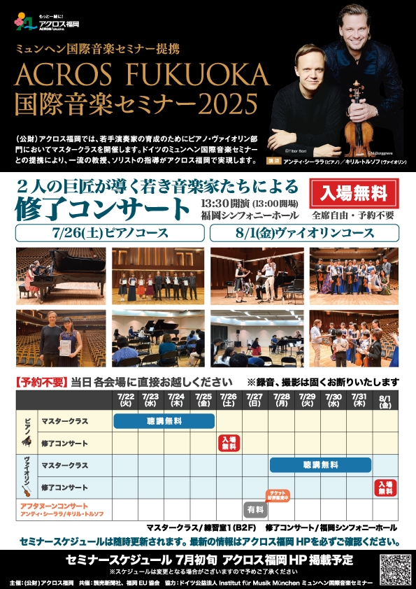 (公財)アクロス福岡では、若手演奏家の育成のためにピアノ・ヴァイオリン部門においてマスタークラスを開催します。ドイツのミュンヘン国際音楽セミナーとの提携により、一流の教授、ソリストの指導がアクロス福岡で実現します。