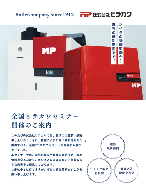 1912年創業のボイラメーカー、株式会社ヒラカワ主催のボイラに関するセミナーです。ボイラの基礎知識や省エネ化に向けて最新のサービス・製品をご紹介します。