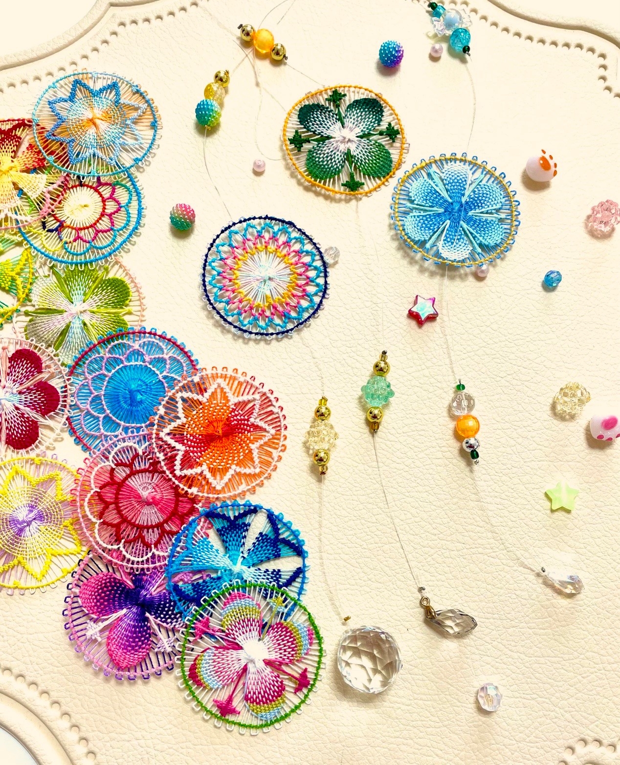 南米パラグアイの伝統工芸のレース編み「ニャンドゥティ」。体験では完成したニャンドゥティにビーズなどを取り付けてサンキャッチャーを作ります。 |