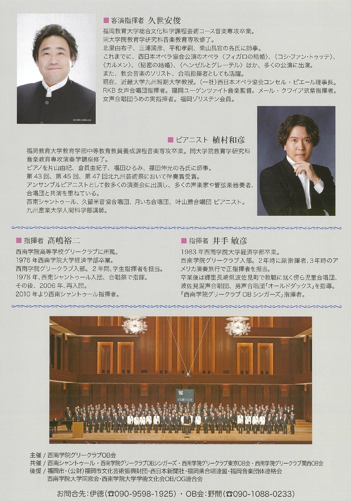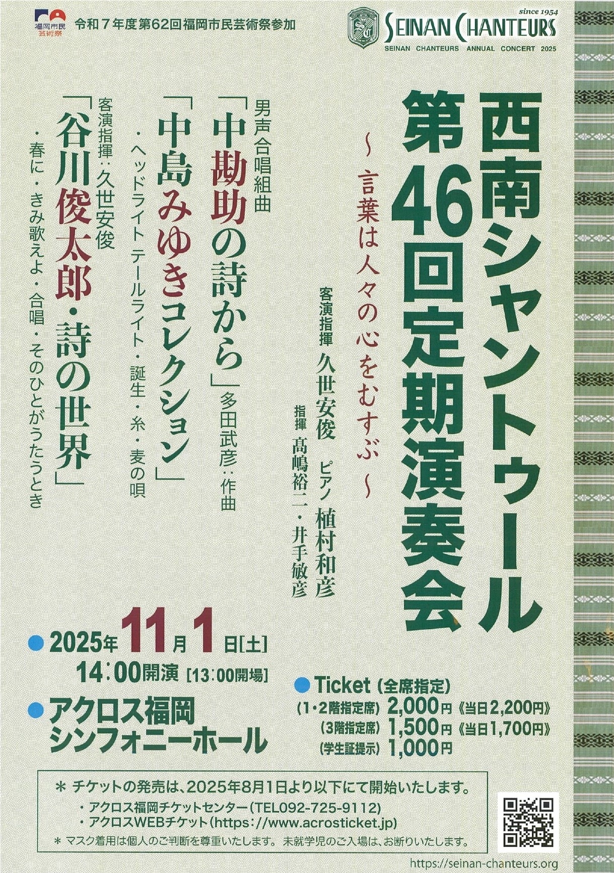 | 曲目 | 男声合唱組曲 「中勘助の詩から」多田武彦:作曲 「中島みゆきコレクション」・ヘッドライト テールライト・誕生・糸・麦の唄 客演指揮:久世安俊 「谷川俊太郎・詩の世界」・春に・きみ歌えよ・合唱・そのひとがうたうとき |