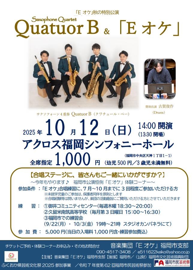 昨年に続き、サクソフォーン4重奏クワチュール・ベーと、「Eオケ」の共演。賛助出演古賀俊作(Drums)。アンサンブルや合唱など、彩り豊かなステージです。