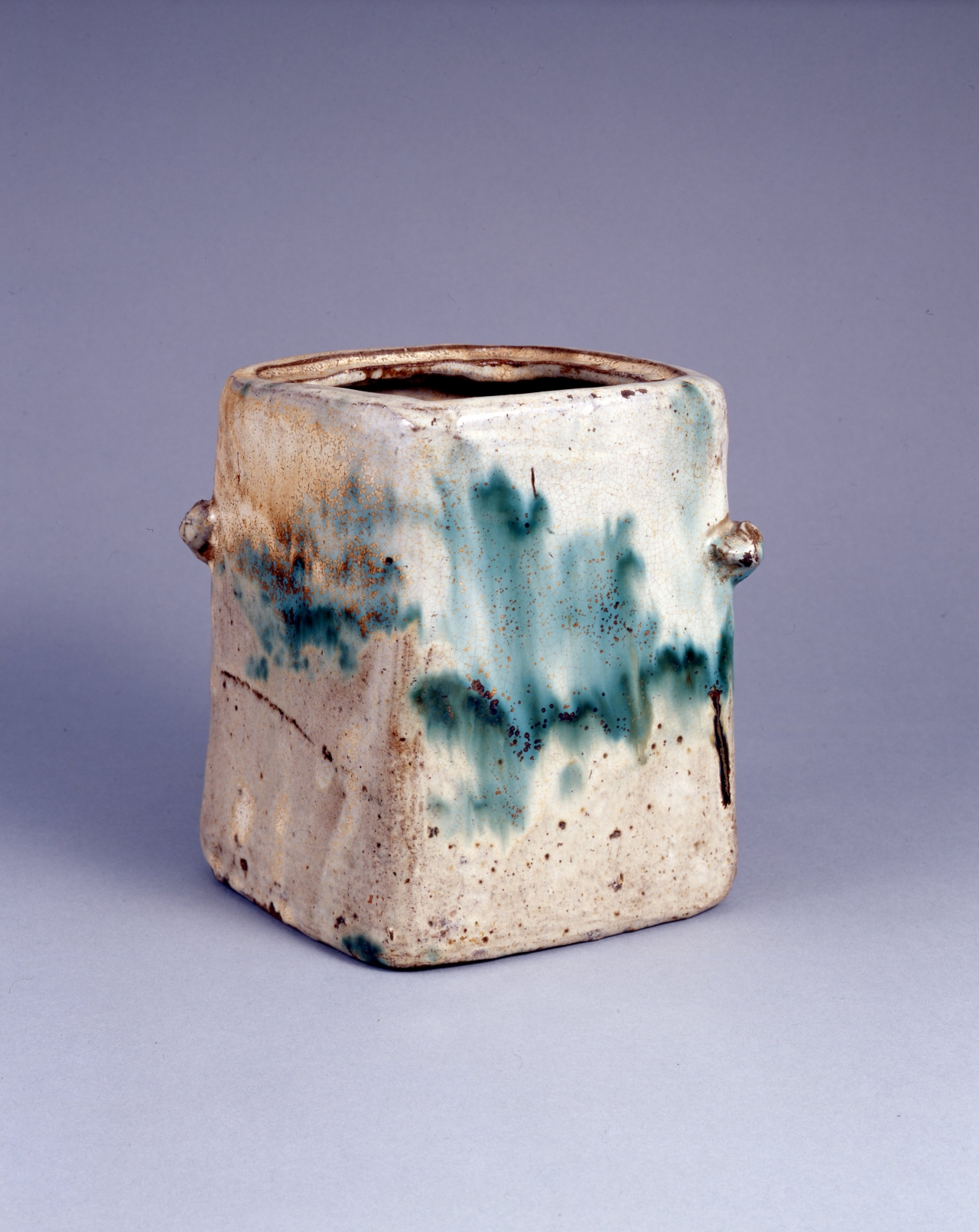 写真:藁灰釉緑釉流四方耳付水指 銘「若葉雨」高取焼 17世紀前半 田中丸コレクション蔵