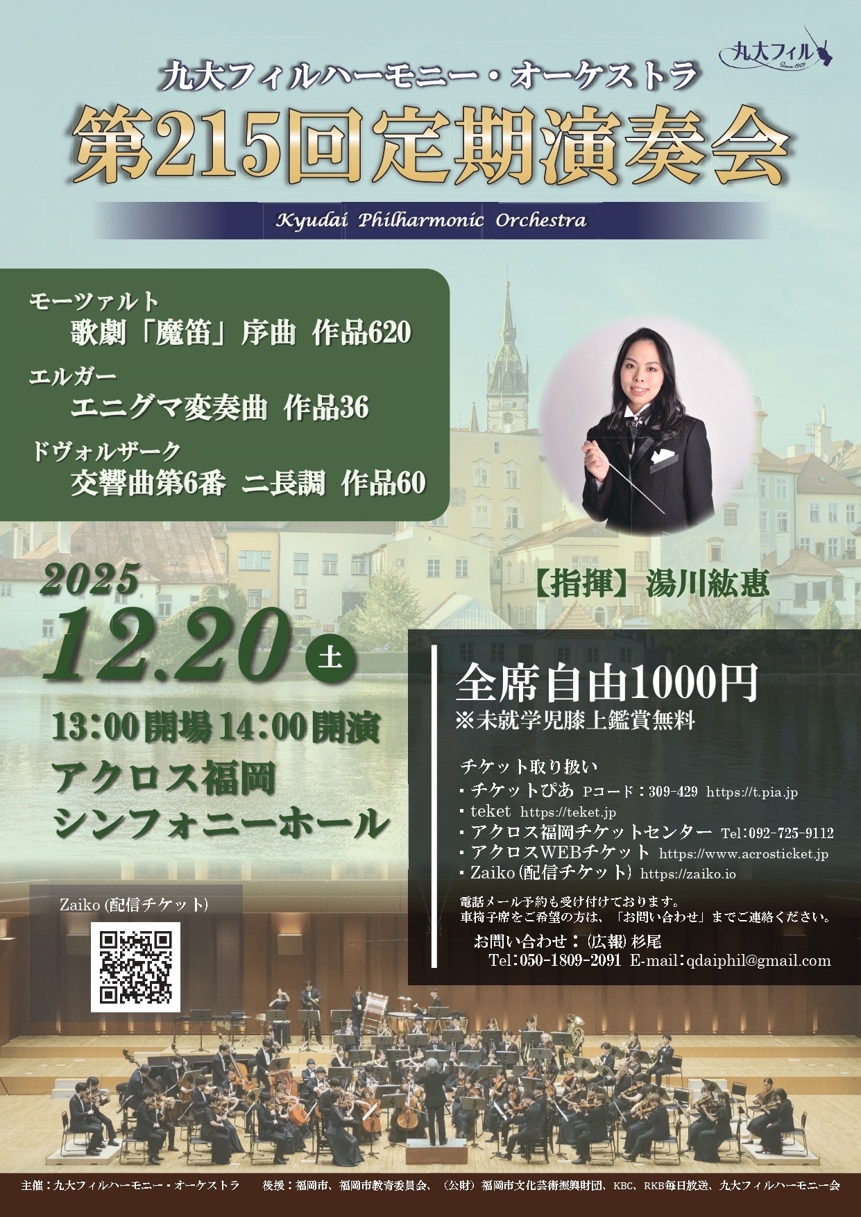 ・アクロス福岡チケットセンター(10:00~18:00 窓口/電話) TEL:092-725-9112 ・アクロスWEBチケット https://www.acrosticket.jp ・九大フィルハーモニー・オーケストラ TEL:050-1809-2091 E-MAIL:qdaiphil@gmail.com ・チケットぴあ(Pコード:309-429) https://t.pia.jp ・Zaiko(オンラインチケット) https://zaiko.io |