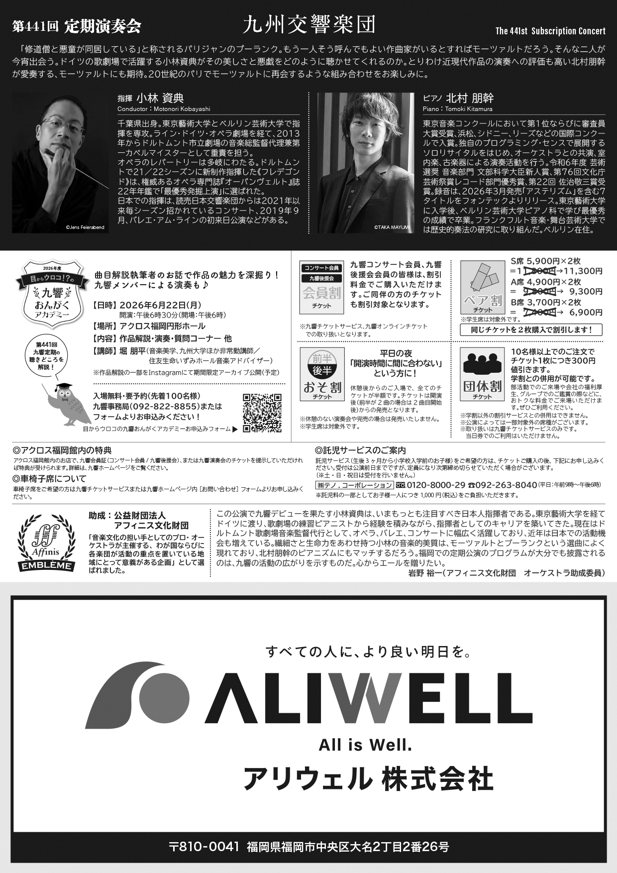 ・アクロス福岡チケットセンター(10:00~18:00) TEL:092-725-9112 ・アクロスWEBチケット https://www.acrosticket.jp ・九響チケットサービス(平日9:30~17:30) TEL:092-823-0101 ・チケットぴあ (Pコード:312-489) https://t.pia.jp ・ローソンチケット(Lコード:83549) https://l-tike.com |