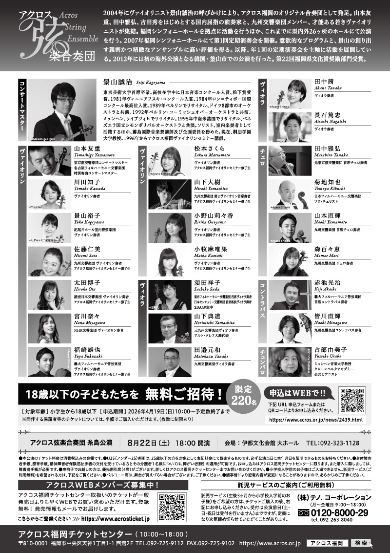 ・アクロス福岡チケットセンター(10:00~18:00) TEL:092-725-9112 ・アクロスWEBチケット https://www.acrosticket.jp ・チケットぴあ(Pコード:318-753) https://t.pia.jp ・ローソンチケット(Lコード:81321) https://l-tike.com/ |