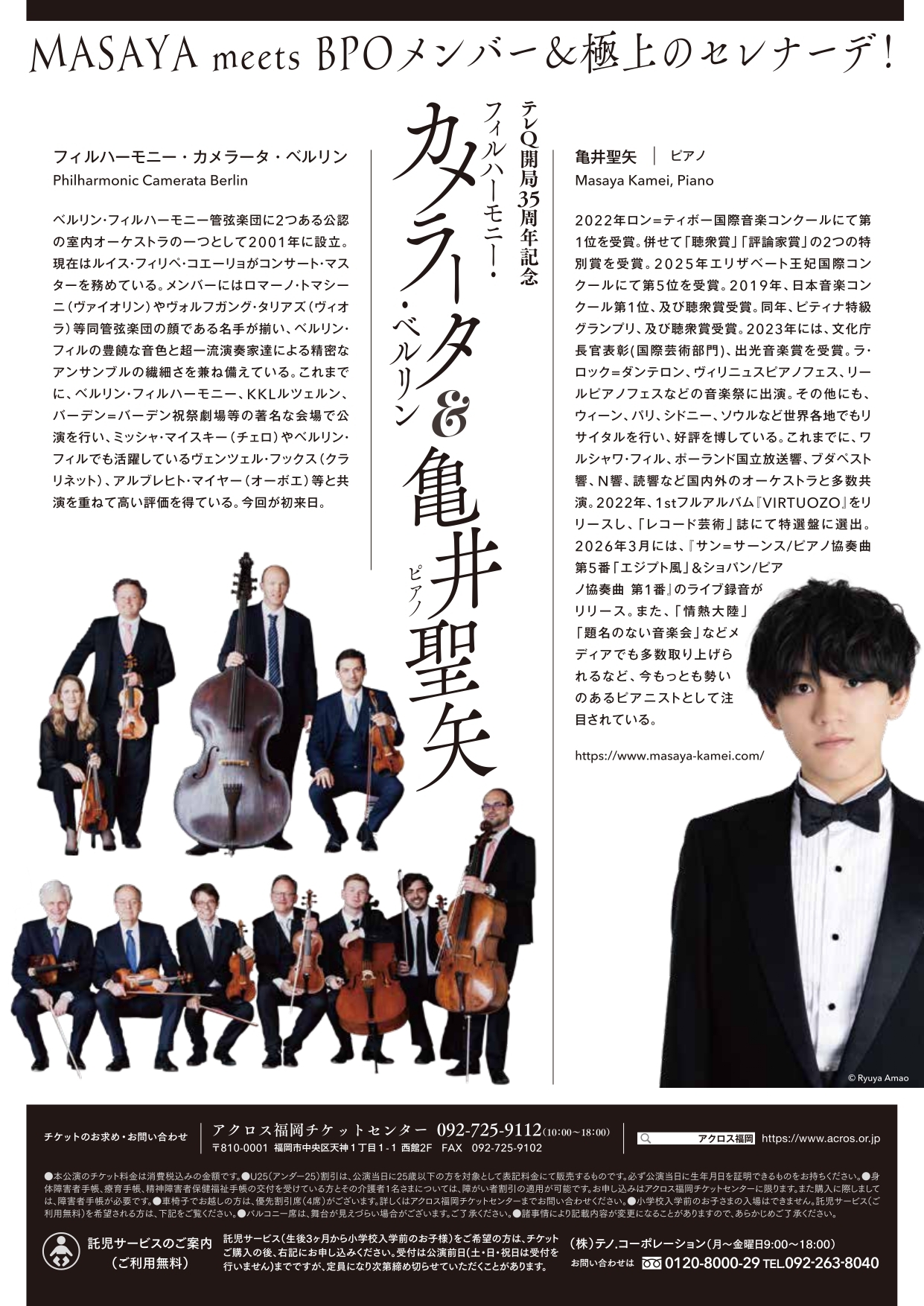 ・アクロス福岡チケットセンター(10:00~18:00) TEL:092-725-9112 ・アクロスWEBチケット https://www.acrosticket.jp ・チケットぴあ(Pコード:320-983) https://t.pia.jp ・ローソンチケット(Lコード:84645) https://l-tike.com ・イープラス https://eplus.jp/ |
