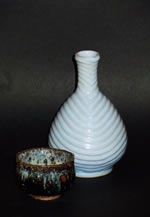 鉄分の多い黒地の飴釉(あめゆう)に白や青みを帯びた藁灰(わらばい)の釉薬が流れた「動」の朝鮮唐津と静けさをイメージした白磁の花瓶や食器などを約100点展示販売します。期間中、陶彫りの実演を行います。