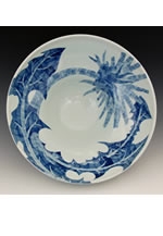 「和紙染」とは形に切った和紙を素地にあて、絵具を筆でしみ込ませる技法です。和紙の重なりが色の濃淡となって、ちぎり絵のような印象をあたえてくれます。展示会ではこの「和紙染」の磁器を中心に、日用雑器から鉢・壺まで約200点を展示販売します。