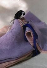 一枚一枚丁寧に草木染めをした布やさまざまな貝殻を使い、おひな様や可愛らしい細工物をつくりました。淡い桃色や薄紫色など自然の恵みの優しい色彩の中に、“華”が感じられると思います。おびな、めびなの衣装は同色のものにして、重ね襟や裏布で変化を付け表現するなど、工夫を凝らしました。