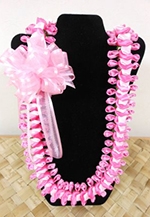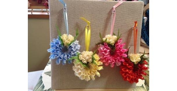 ハワイアンリボンレイは、色々な種類のリボンや毛糸を縫ったり、編んだりして生花そっくりに表現したものです。色鮮やかな作品を30点展示します。