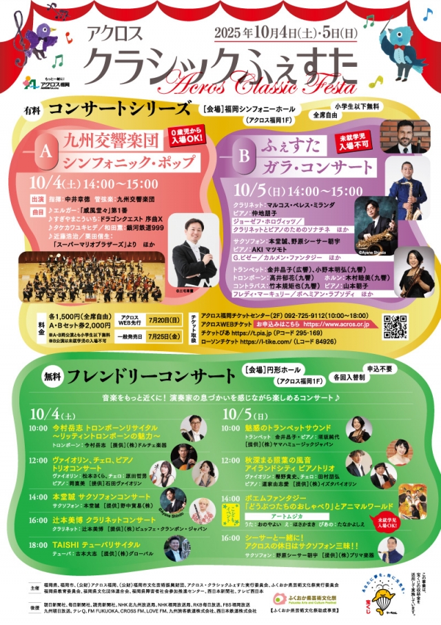 「アクロス・クラシックふぇすた2025」開催決定!今年も小学生以下無料で2つのスペシャルコンサートをお届けします。10月4日のA公演「九州交響楽団シンフォニック・ポップ」では、迫力のオーケストラ体験が楽しめます。0歳児から入場OK!そして10月5日のB公演「ふぇすたガラ・コンサート」は、クラシックふぇすたを彩る演奏家たちによる共演です。2公演のお得なセット券も発売!7/20(日)10:00よりWEB先行発売です。アクロス館内が音楽の遊園地に♪ご家族、ご友人と一緒に楽しみましょう!