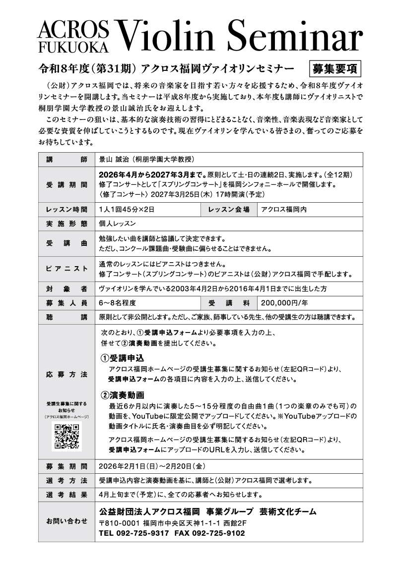 (公財)アクロス福岡では、将来の音楽家を目指す若い方々を応援するため、令和8年度ヴァイオリンセミナーを開講します。当セミナーは平成8年度から実施しており、本年度も講師にヴァイオリニストで桐朋学園大学教授の景山誠治氏をお迎えします。