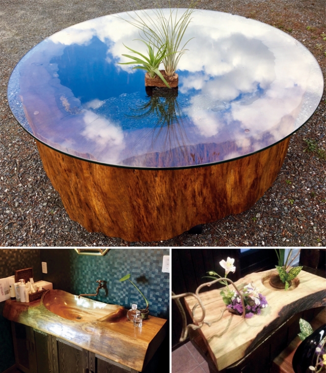 Woodworking Studio & Gallery Fujiyan utilizes the natural forms of wood based on the concept of creating furniture with a sense of warmth that people of all ages can use with peace of mind. The exhibits here include a table made by placing reinforced glass over a large hollow log that creates an imposing piece that can also be enjoyed as an interior decoration. Also on display and for sale are items including furniture made from single planks of wood, full-length mirrors, bottle holders, and chopping boards.