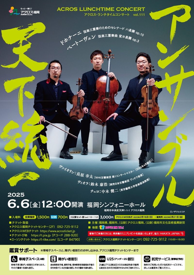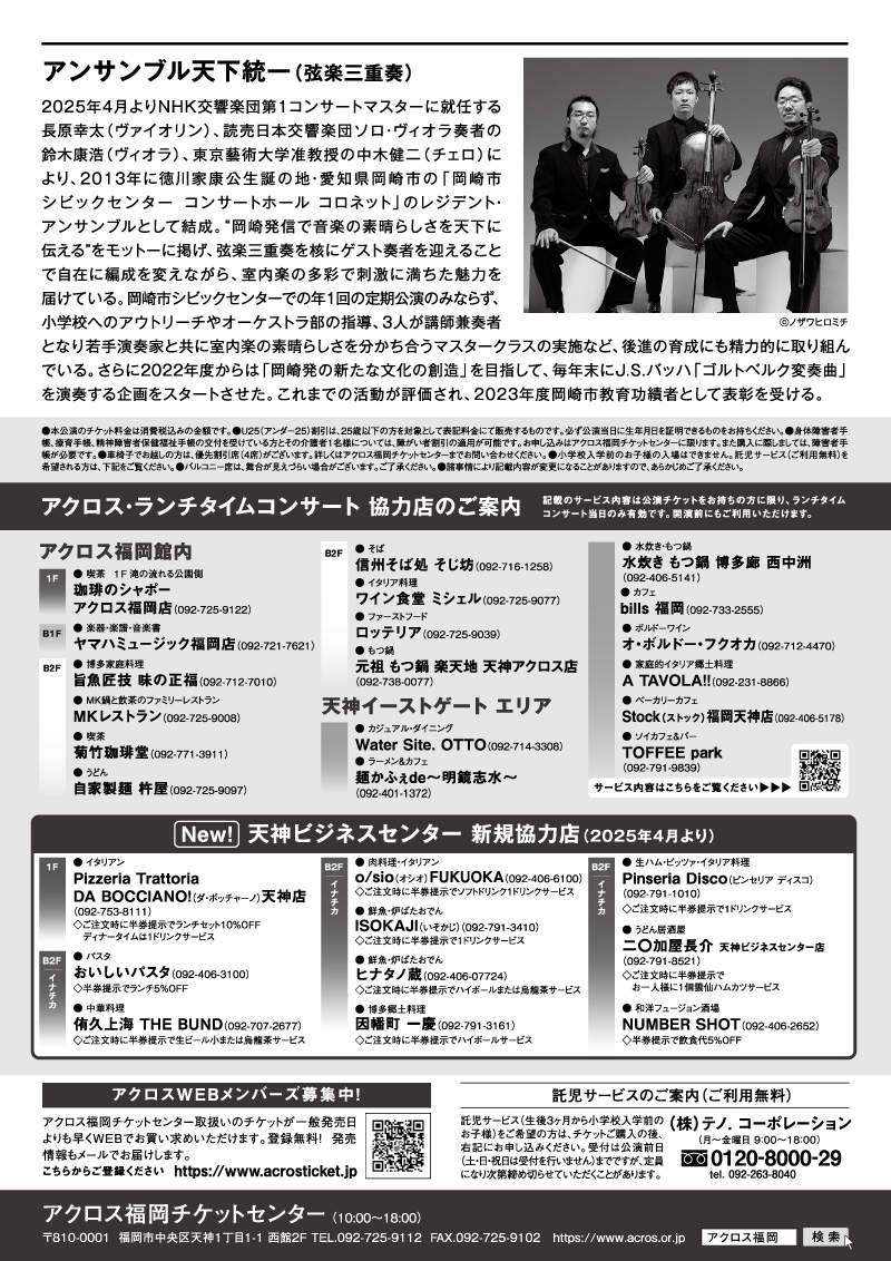 ACROS Lunchtime Concert First-Half 3-Concert Set Ticket Regular Price: ¥4,500 → Set Ticket: ¥3,000 (All Seats Reserved) |