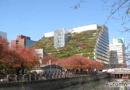 The rooftop green area extends for 5,400㎡ from the 2F to the 14F. After construction, 76 varieties totaling 37,000 plants were planted. Subsequent additional planting and the dispersal of seeds by wild birds have served to bring even greater diversity to the garden, which currently boasts 120 different varieties and a total of 50,000 plants.