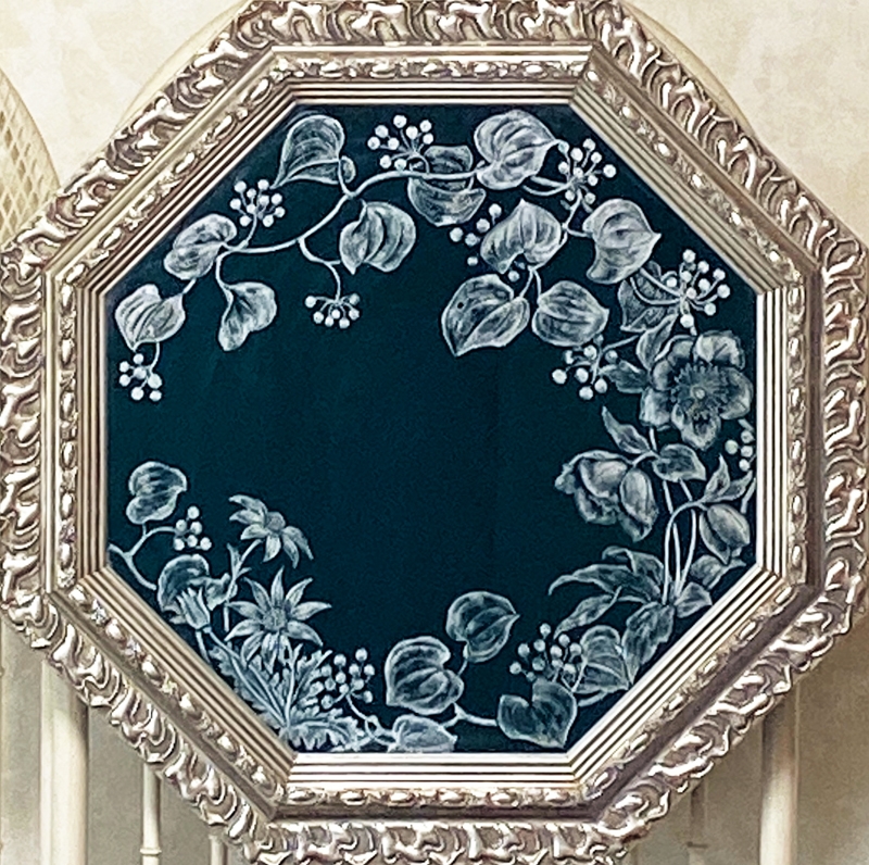 手彫りガラス工芸とは、ダイヤモンドの粉のついた針で、ガラスに模様を彫る工芸です。鉛筆画のようなタッチで線や点を描くように彫っています。今回は春らしい草花や、風景などを彫った壁掛け鏡、ガラスの花器、お皿などを展示販売します。(約60点展示)