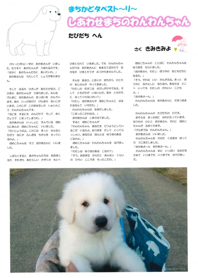 グレートピレニーズの視点から、何気ない日常の中にある様々な幸せを、読者に伝える創作童話「しあわせまちのわんわんちゃん」をタペストリー仕様の物語絵本として展示します。「タペスト~リ~」とはタペストリーとストーリーの複合造語です。様々な人たちが集まる場所に展示された私たちの絵本が、幸せを感じるささやかな機会となれば、と考えています。