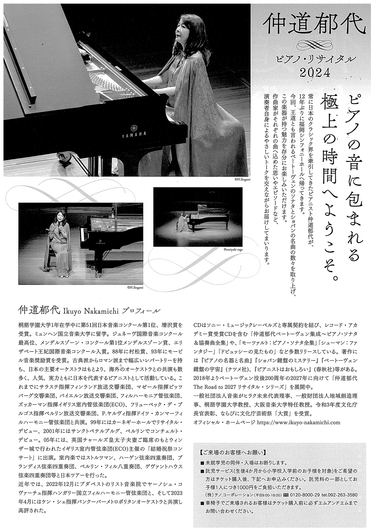 ・アクロス福岡チケットセンター TEL:092-725-9112 https://www.acrosticket.jp(インターネット購入) ・エムアンドエム TEL:092-751-8257(平日10:00~18:00) ・チケットぴあ(Pコード:251-917) https://t.pia.jp ・ローソンチケット(Lコード:82329) https://l-tike.com/ ・e+(イープラス) https://eplus.jp/ |