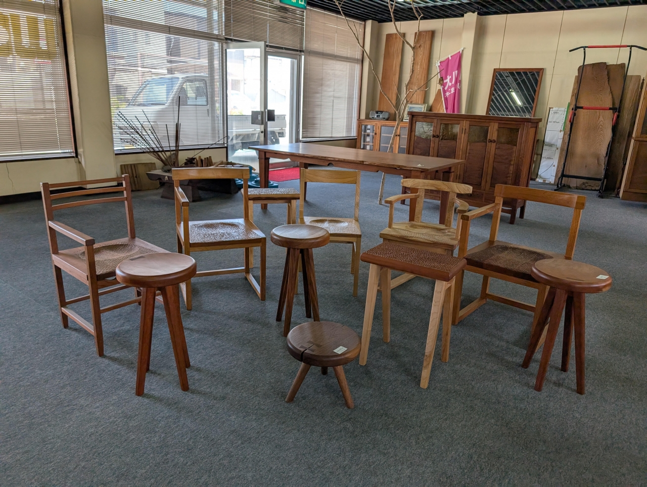 様々な種類の樹木を使い、手作りで制作したテーブルやチェストなどの家具をはじめ、カッティングボードや花台、コースターなどの人気の小物を展示販売いたします。