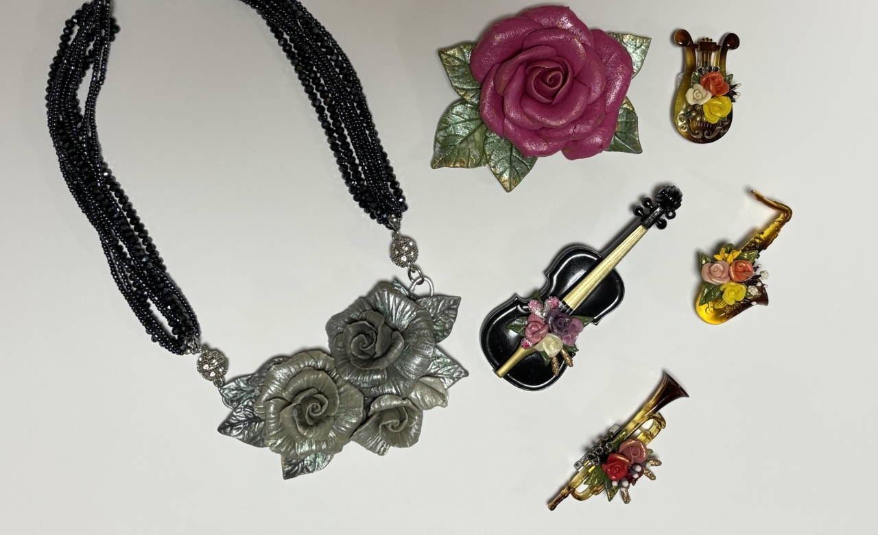 いつまでも色あせない美しい花パンフラワーと銀粘土、ガラスを主として自由に造形したアクセサリーなど、すべて一点ものでひとつひとつ心をこめて作りました。