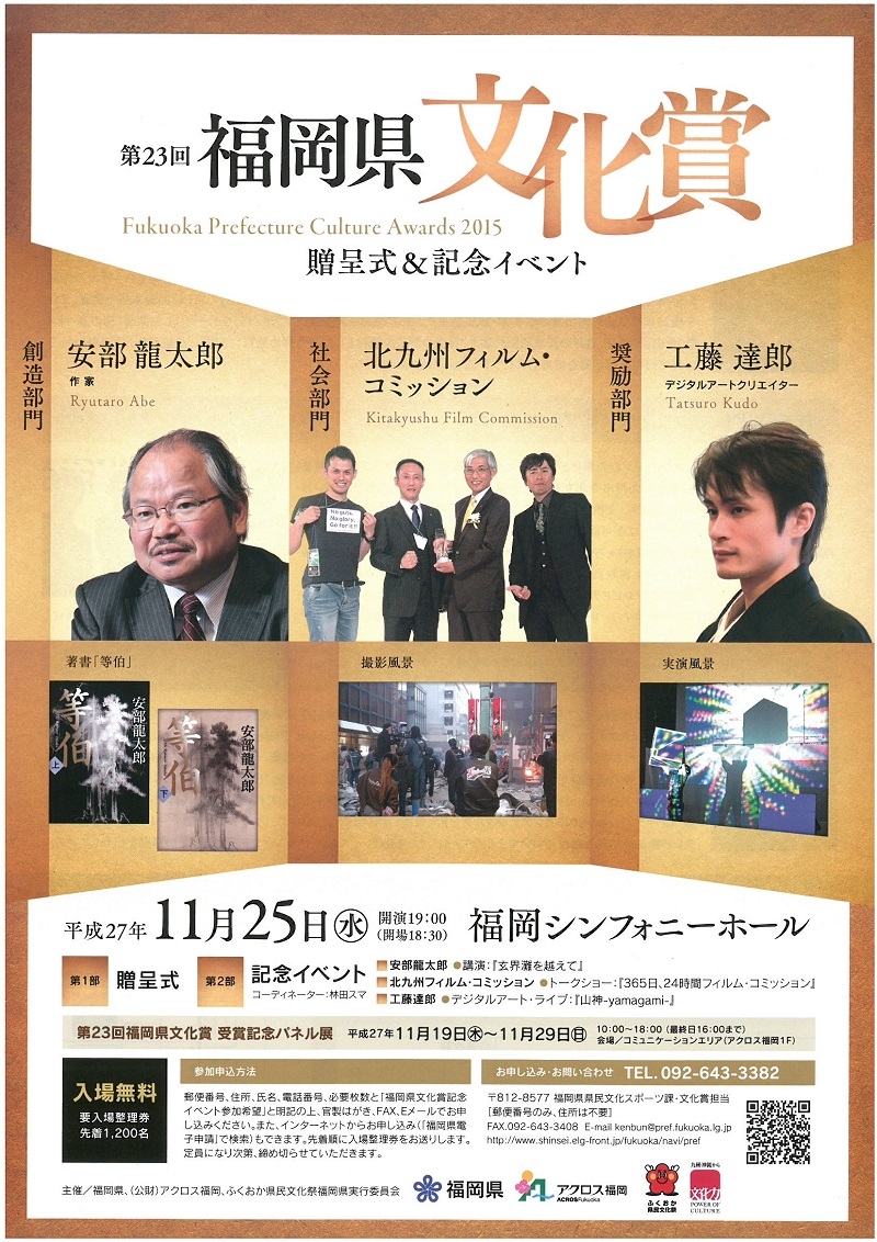 | 第2部 | 記念イベント コーディネーター/林田スマ ■安部龍太郎 講演『玄界灘を越えて』 ■北九州フィルム・コミッション トークショー『365日、24時間フィルム・コミッション』 ■工藤達郎 デジタルアート・ライブ『山神-yamagami-』 |