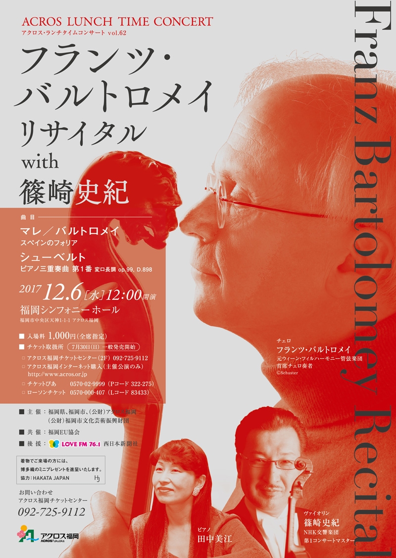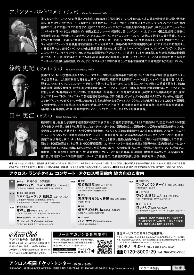 チェロ/フランツ・バルトロメイ(元ウィーン・フィル首席チェロ奏者) ヴァイオリン/篠崎史紀(NHK交響楽団第1コンサートマスター) ピアノ/田中美江 |