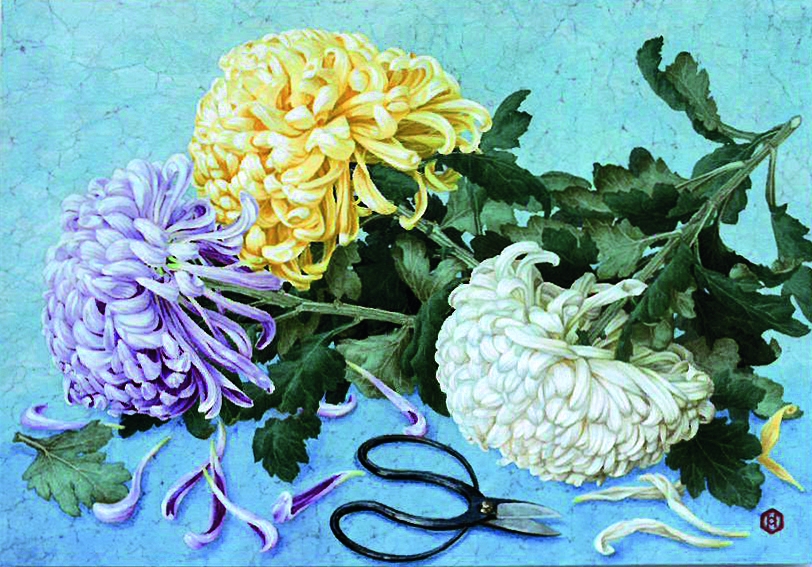 2000年に会を結成して初めてのグループ展です。日本画の画材や技法を用いて描きました。草花や人物などをモチーフに、現代的な作風のものから伝統的な仏画など、22点の作品を展示します。