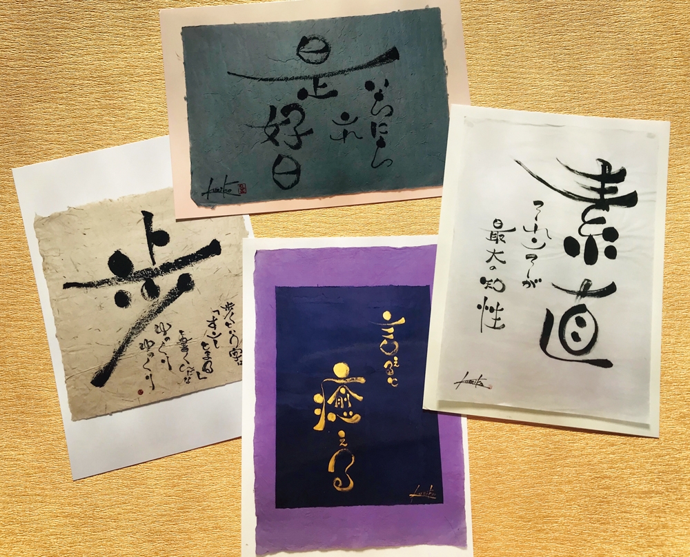 格言など心にひびくことばを筆文字で書いたデザイン書道作品を約30点展示します。まあるくゆるゆるとした優しい書体で描くように書かれた言の葉が見る方の心を温め、癒やせたらと願っています。
