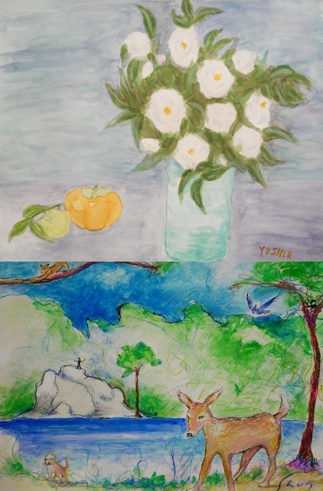 南障がい者フレンドホームで絵画教室を受講している2人による「二人展」を行います。全てに思いをこめて一生懸命描いた作品を、ぜひご覧ください。(20点展示)